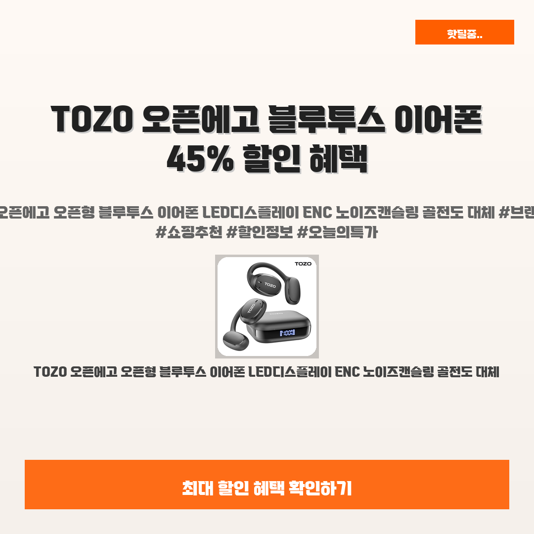 🛍️ 이 포스팅은 네이버 쇼핑 커넥트 활동의 일환으로,판매 발생 시 수수료를 제공받습니다.오늘 소개할 제품은 정말 놀라운,바로 TOZO 오픈에고 오픈형 블루투스 이어폰입니다!평소 음악이나 영화를 즐길 때 이어폰 소음이 신경 쓰이셨나요?걱정 마세요! TOZO 오픈에고는 LED디스플레이와 ENC 노이즈캔슬링 기능으로 소음 걱정 없이 몰입할 수 있게 해줄 거예요.진짜 이렇게 편안한 착용감의 골전도 대체 제품을 찾기 힘든 거 아시죠? 특별한 가격으로 여러분께 제공됩니다! 45% 할인된 가격, 59,000원에 만나보세요. 더 이상 망설이지 마세요!여러분도 이 완벽한 음질 경험을 놓치지 마시길 바랍니다. 이 기회를 통해 저렴하게 TOZO 오픈에고를 손에 넣어보세요!TOZO 오픈에고 오픈형 블루투스 이어폰 LED디..
